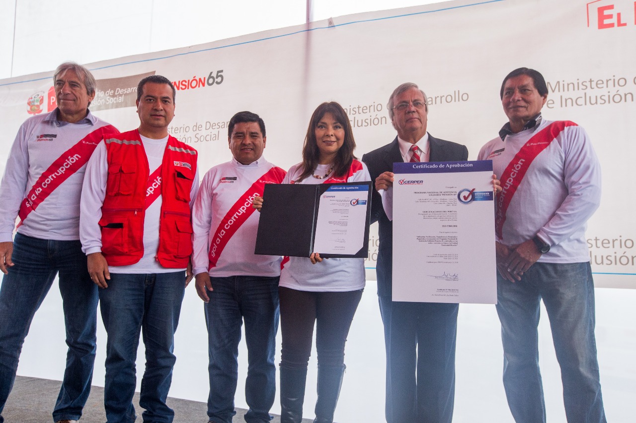En reconocimiento a su Sistema de Gestión Antisoborno-Anticorrupción, la empresa Certificaciones del Perú S.A. - Cerper, entregó a la ministra La Rosa, la Certificación Internacional ISO 37001:2016 obtenida por el Programa Nacional de Asistencia Solidaria – Pensión 65.