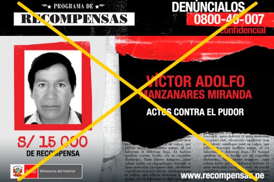 Luego de una acción de inteligencia operativa, efectivos de la Policía Nacional del Perú (PNP) capturaron a Víctor Adolfo Manzanares Miranda, requerido por el Cuarto Juzgado Penal Liquidador de Huancayo por el delito de actos contra el pudor, informó el Ministerio del Interior.