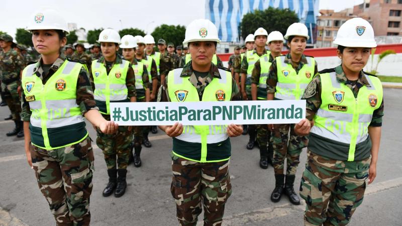 “¡Estamos contigo, policía Miranda!”, fue el grito pronunciado al unísono por cientos de agentes formados en el patio principal de la sede ministerial, durante la ceremonia de izamiento, que esta vez conmemoró el 17° aniversario de la Defensoría del Policía.