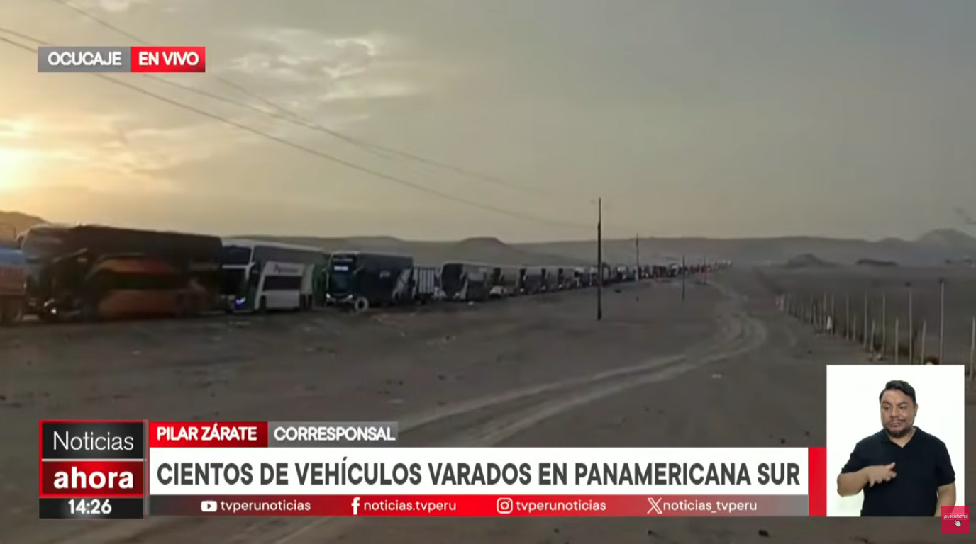 Cientos de vehículos de transporte de pasajeros y carga pesada permanecen varados en un tramo de diez kilómetros, en ambos sentidos de la carretera Panamericana Sur, a la altura del distrito de Ocucaje, provincia y región Ica, ello tras la caída de un huaico.