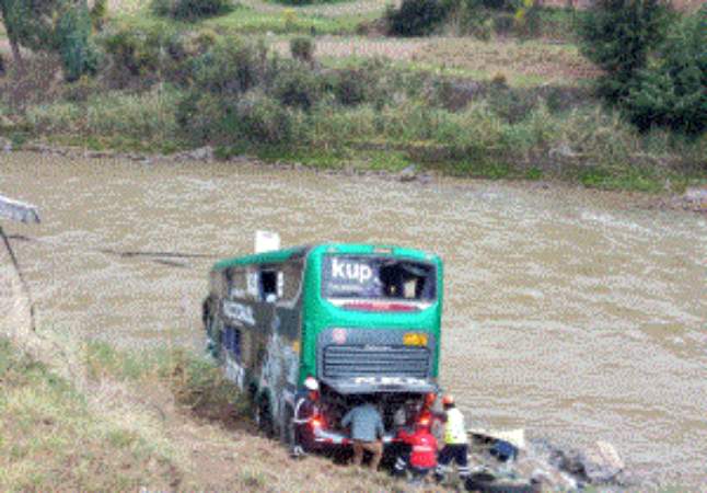 Esta madrugada, un bus interprovincial de la empresa de transportes Expreso Nacional impactó contra un automóvil particular a la altura del kilómetro 66 de la Carretera Central, en el distrito de Parco, provincia de Jauja. Como consecuencia del choque, el ómnibus cayó al río Mantaro, aunque no dejó víctimas fatales, sí provocó varios heridos.