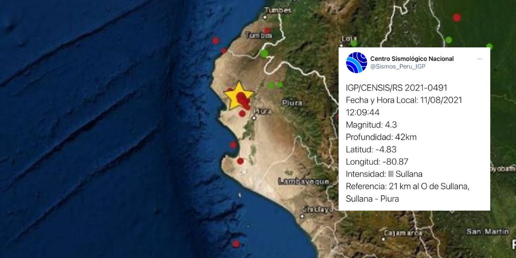 El epicentro del movimiento telúrico, sentido a las 12:09 a. m.,se ubicó a 21 kilómetros al oeste de Sullana, a una profundidad de 42 kilómetros.