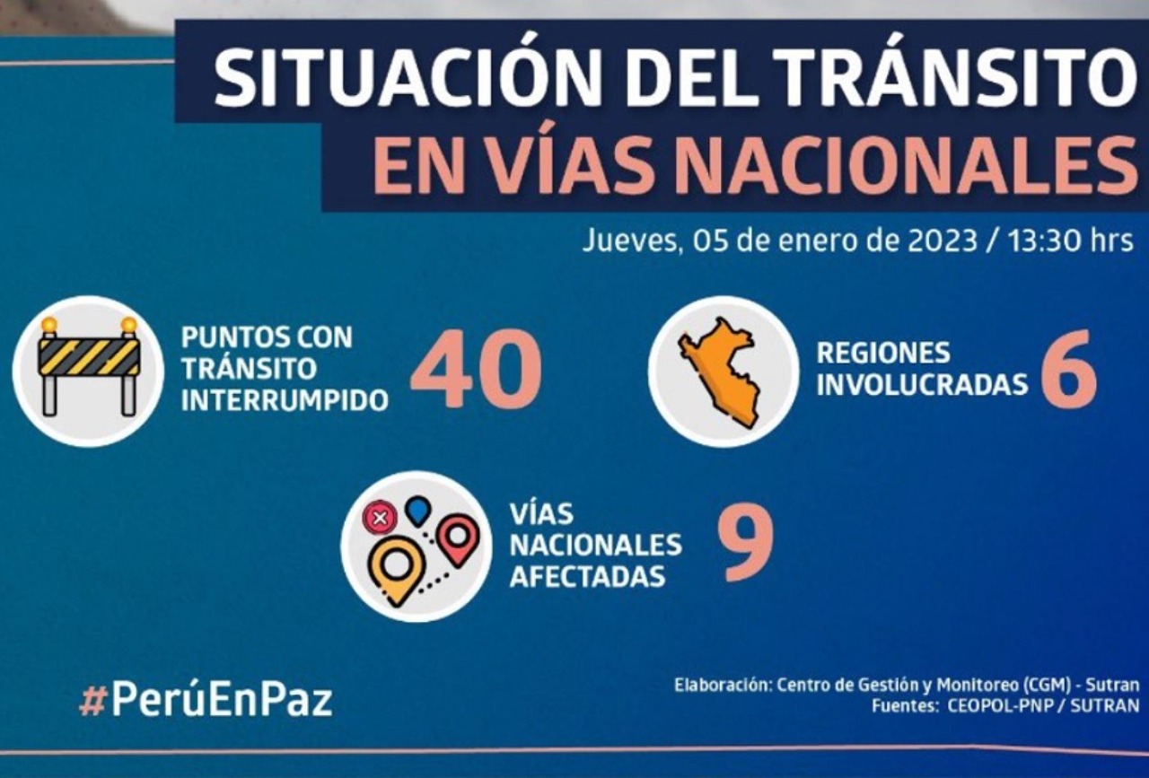 La Superintendencia de Transporte Terrestre de Personas, Carga y Mercancía (Sutran) reportó el mediodia del miercoles 5 de enero, mediante su mapa interactivo de la Red Vial Nacional que el tránsito se encuentra interrumpido en 40 puntos de diversas carreteras en 6 regiones de la Sierra sur principalmente, debido a protestas sociales y que son 9 las vías nacionales afectadas por las protestas de grupos de personas en diversas localidades del país.