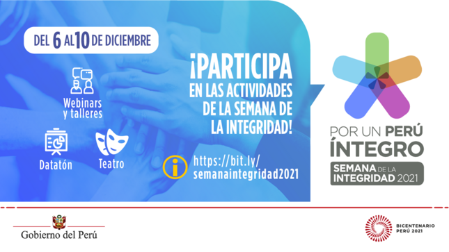 Con el objetivo de promover un espacio de reflexión sobre los efectos de la corrupción y una participación más activa de las personas e instituciones a fin de elevar los estándares de integridad en el país, la Presidencia del Consejo de Ministros (PCM), a través de la Secretaría de Integridad Pública, desarrollará la “Semana de la Integridad 2021”, entre el 6 y 10 de diciembre