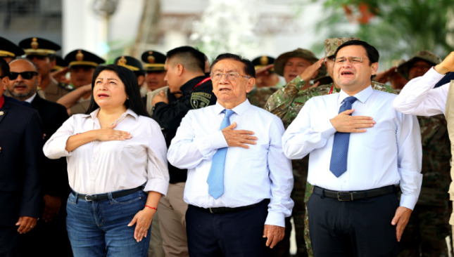 Durante el acto, el mandatario estuvo acompañado por la presidenta del Consejo de Ministros, Denisse Miralles; el ministro de Defensa, Luis Arroyo; el ministro del Interior, Hugo Begazo; el gobernador regional de Lambayeque, Jorge Pérez; así como por autoridades locales y representantes de las Fuerzas Armadas y la Policía Nacional.