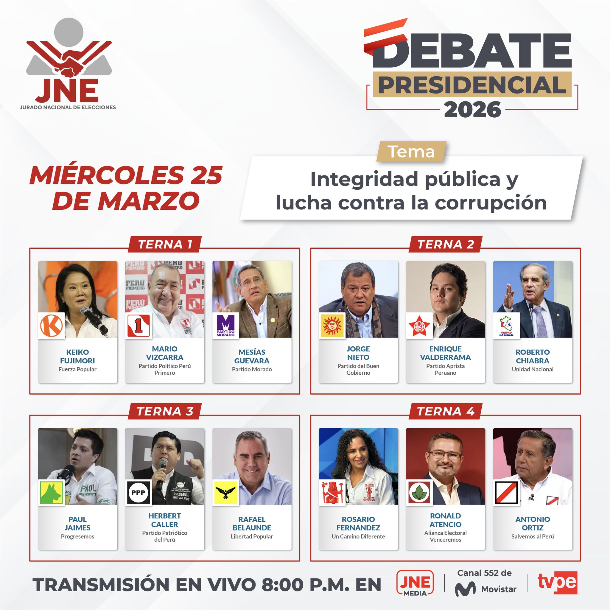 El Instituto Nacional de Radio y Televisión del Perú (IRTP), a través de su multiplataforma, transmitirá el debate presidencial organizado por el Jurado Nacional de Elecciones (JNE) los días 23, 24, 25, 30 y 31 de marzo; y el 1 de abril, en el horario de 7:30 p. m. hasta las 11:00 p. m.