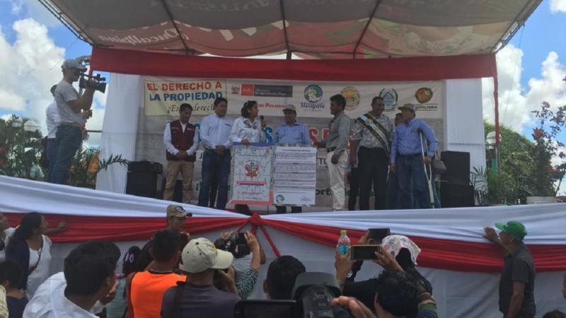 La viceministra de Políticas Agrarias, María Rojas Junes, y el gobernador regional de Ucayali, Francisco Pezo Torres, entregaron 430 títulos de propiedad, que beneficia a 2,020 pobladores.