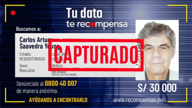La Policía Nacional del Perú (PNP) capturó en La Libertad a Carlos Arturo Saavedra Young, incluido en el Programa de Recompensas del Ministerio del Interior (Mininter) por los presuntos delitos de robo agravado, tráfico ilícito de drogas y lavado de