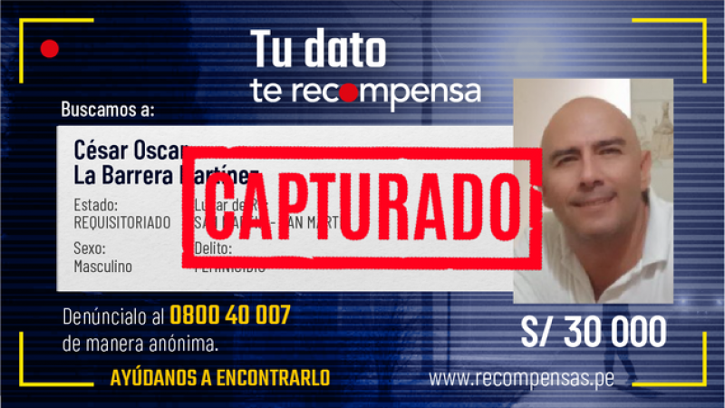 La Policía Nacional del Perú (PNP) capturó a César Óscar La Barrera Martínez, incluido en el Programa de Recompensas del Ministerio del Interior (Mininter), al estar requisitoriado por el delito de feminicidio contra su expareja y la hija de esta últ