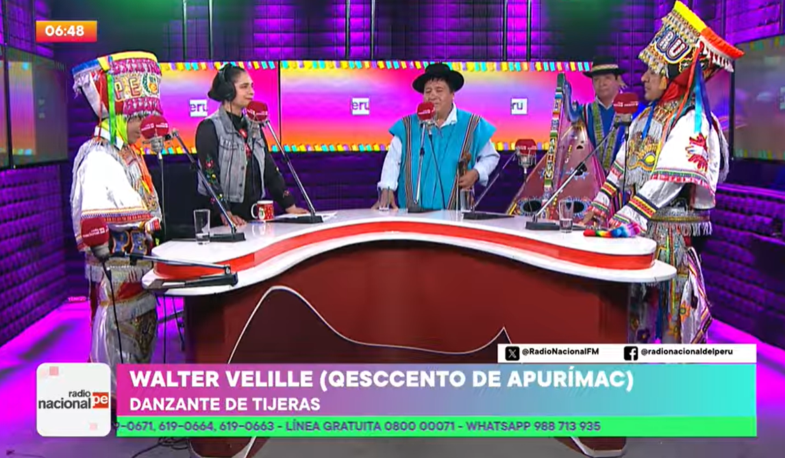 Walter Velille (Qesqento de Apurímac) y Mauro Gamboa (Gringucha de Sucre), reconocidos danzantes de tijeras del país, estuvieron presentes en el programa Ayni Takiy, donde no solo realizaron demostraciones de esta danza, sino que también compartieron detalles sobre este arte.