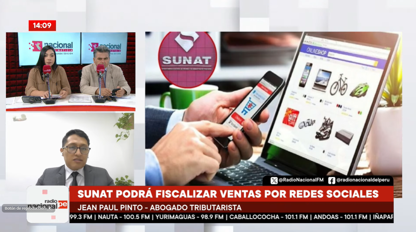 La Superintendencia Nacional de Aduanas y de Administración Tributaria (Sunat) ha sido facultada para fiscalizar ventas realizadas a través de redes sociales mediante mecanismos virtuales. Así lo explicó el abogado tributarista Jean Paul Pinto en entrevista con "Nacional en la noticia".