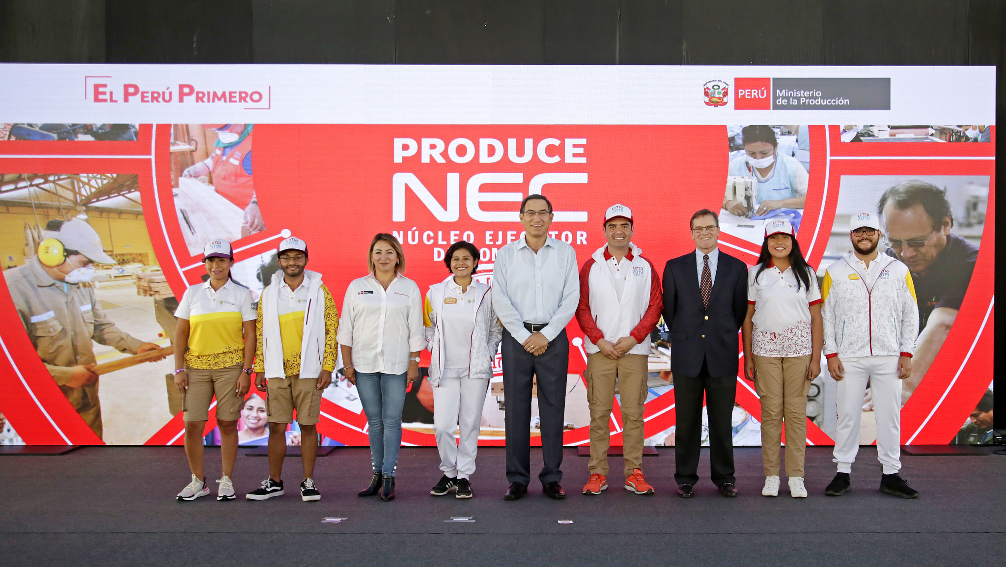 Este acto se realizó en la Explanada Playa Sur del Ministerio de la Producción, con la participación del Presidente de la República, Martín Vizcarra; el Presidente del Comité Organizador de Lima 2019, Carlos Neuhaus; y la ministra de la Producción, Rocío Barrios.
