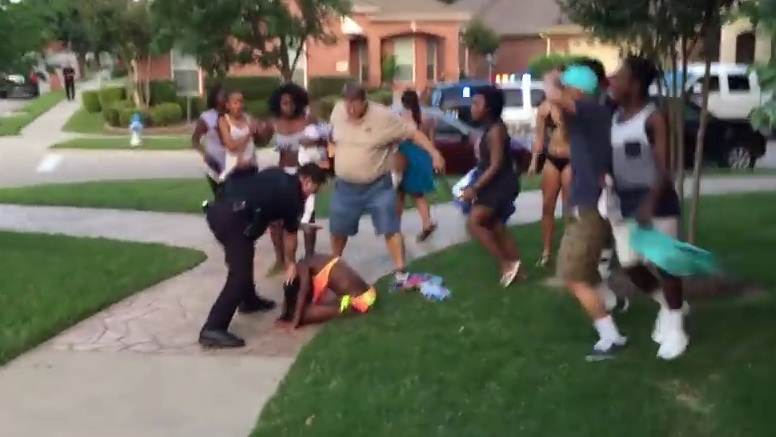 En una caótica escena en la que se puede ver a adolescentes corriendo en la zona de la piscina para evadir a la policía, un oficial tira a una chica negra al suelo y la sujeta, desenfundando luego su arma cuando dos jóvenes negros se aproximan, aparentemente para interceder por ella.