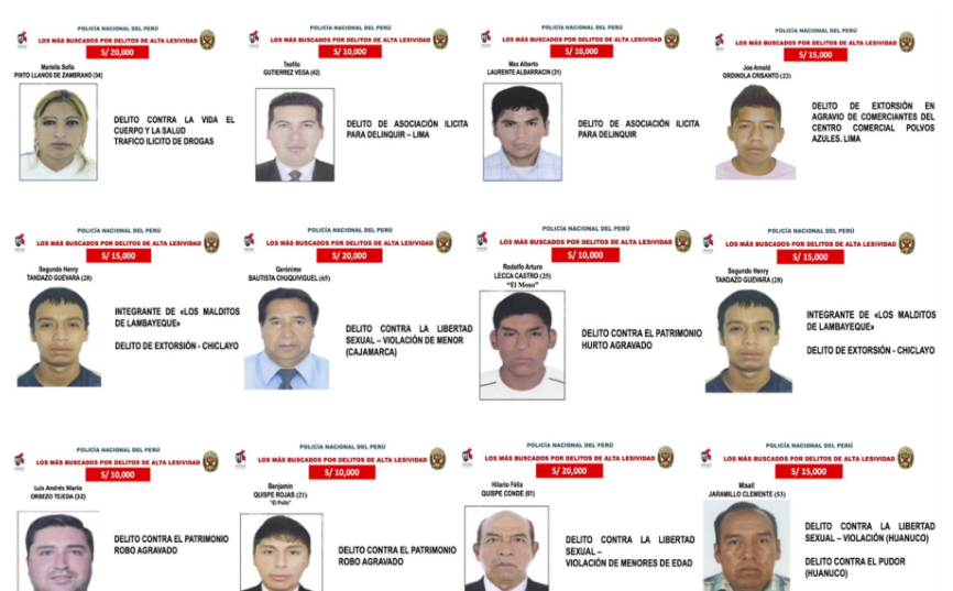 El Ministerio del Interior dio a conocer una nueva lista con los nombres de los 76 delincuentes más buscados del país y los montos de recompensas que se ofrecerá a las personas que brinden información para lograr con éxito su captura.