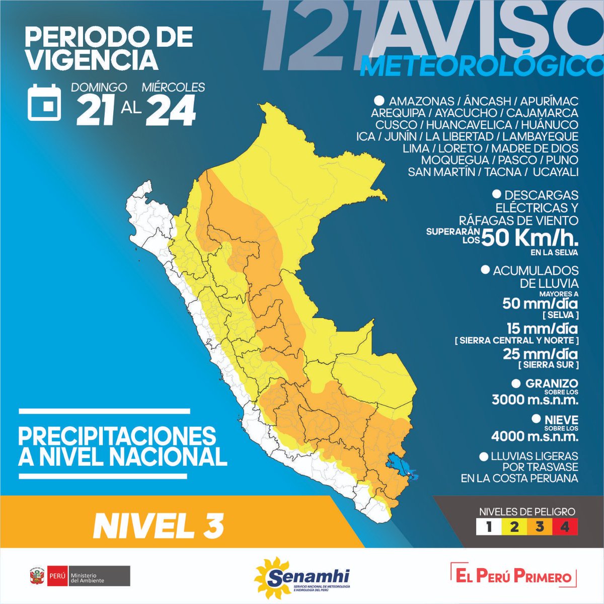 De acuerdo con el Aviso Meteorológico del Servicio Nacional de Meteorología e Hidrología las lluvias más intensas se presentarán el lunes 22 con valores que superarían los 50 milímetros por día en selva, acompañadas de ráfagas de viento con velocidades de hasta 50 kilómetros por hora.