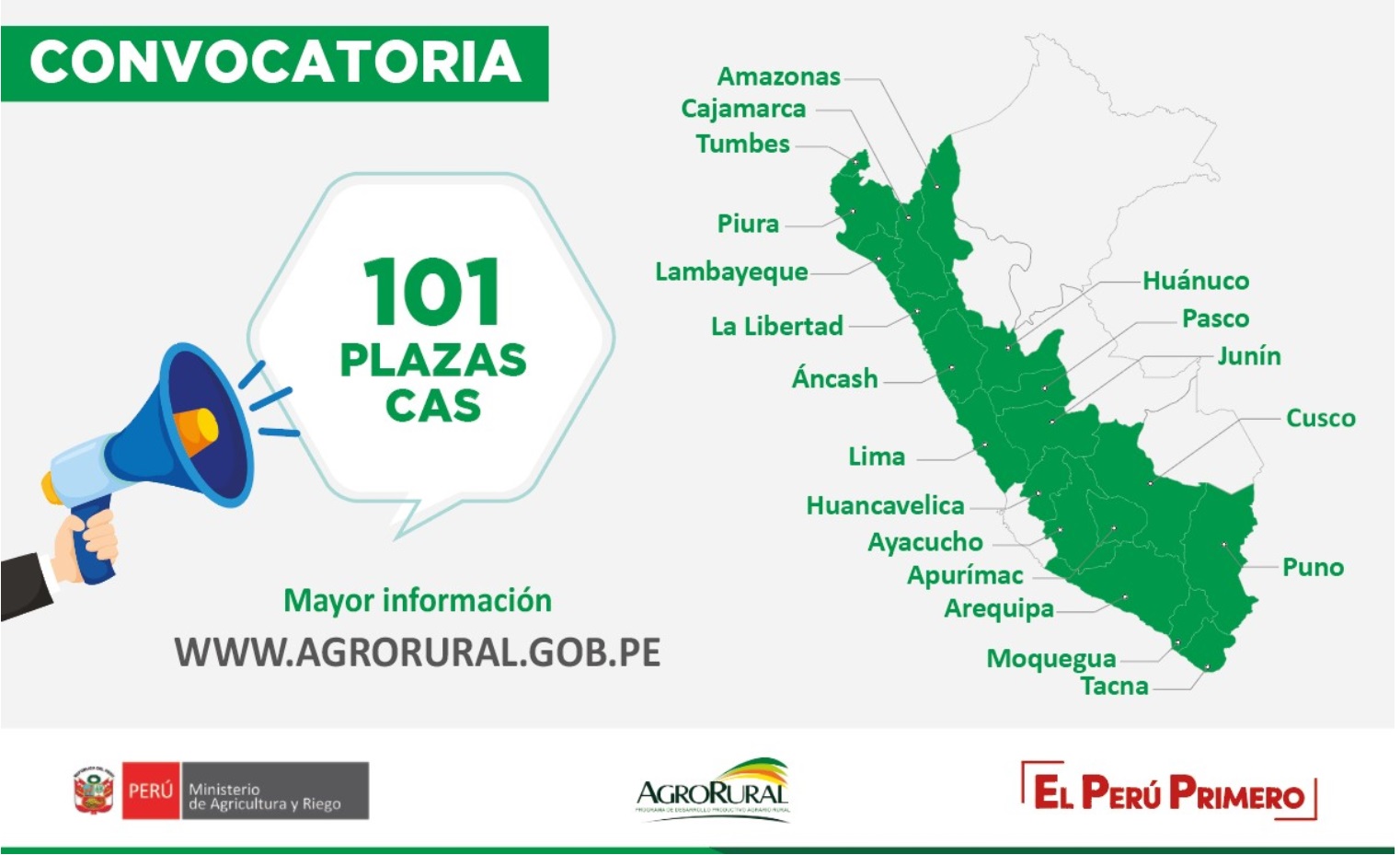 El Programa de Desarrollo Productivo Agrario Rural (Agro Rural) del Ministerio de Agricultura y Riego (Minagri) inició el proceso público de selección de 101 plazas por Contrato Administrativo de Servicios (CAS) para la sede central y direcciones zonales en 19 departamentos del país.