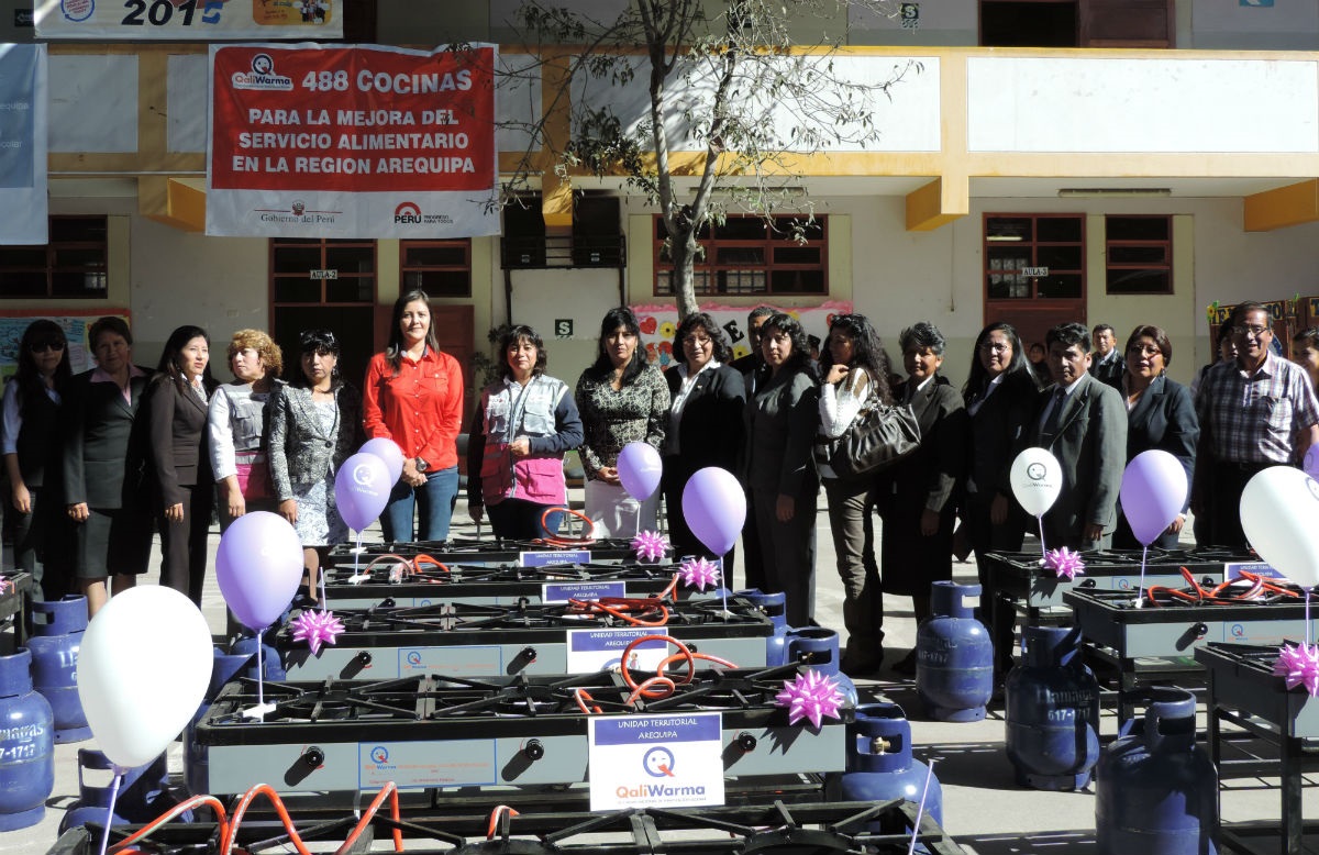 La Directora Ejecutiva del Programa Nacional de Alimentación Escolar Qali Warma del MIDIS, Mónica Moreno Saavedra , entregó cocinas semi industriales GLP a las instituciones educativas públicas del distrito de Cerro Colorado, en Arequipa, para facilitar la preparación de los desayunos que consumen diariamente los niños y niñas de esta zona del país.