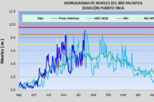 La mañana de ayer, el río Pachitea alcanzó 9.10 metros en la estación Puerto Inca, región Huánuco, muy cerca de alcanzar alerta roja y su nivel crítico de inundación, que es de 9.60 metros.