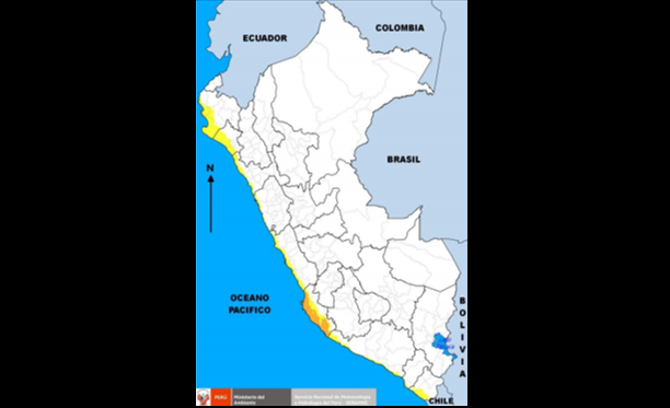 Los departamentos alertados son: Piura, Lambayeque, La Libertad, Ancash, Lima, Ica, Arequipa, Moquegua Y Tacna.