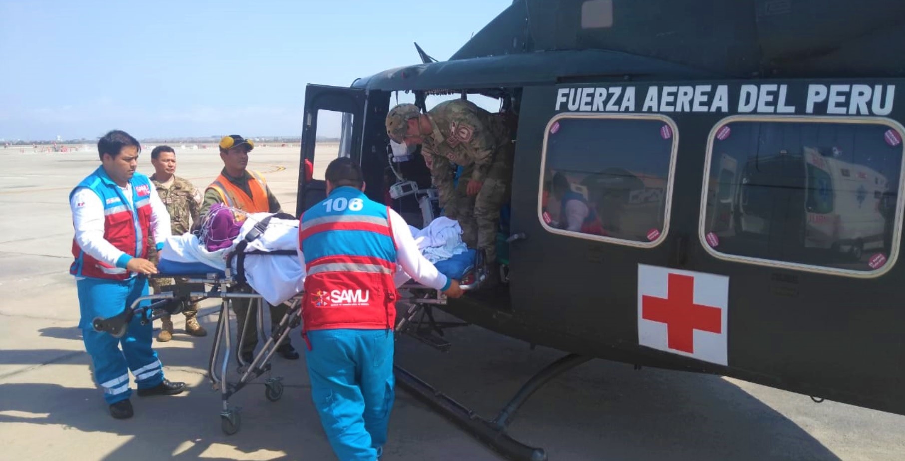 El Servicio de Atención Móvil de Urgencia (SAMU) del Ministerio de Salud (Minsa) y la Fuerza Aérea del Perú (FAP) del Ministerio de Defensa (Mindef), con el financiamiento del Seguro Integral de Salud (SIS) realizaron un puente aéreo para trasladar a Lima a una joven madre (15 años de edad), con iniciales H.C.E., desde Chincha, a donde llegó vía terrestre procedente del hospital Regional de Huancavelica.