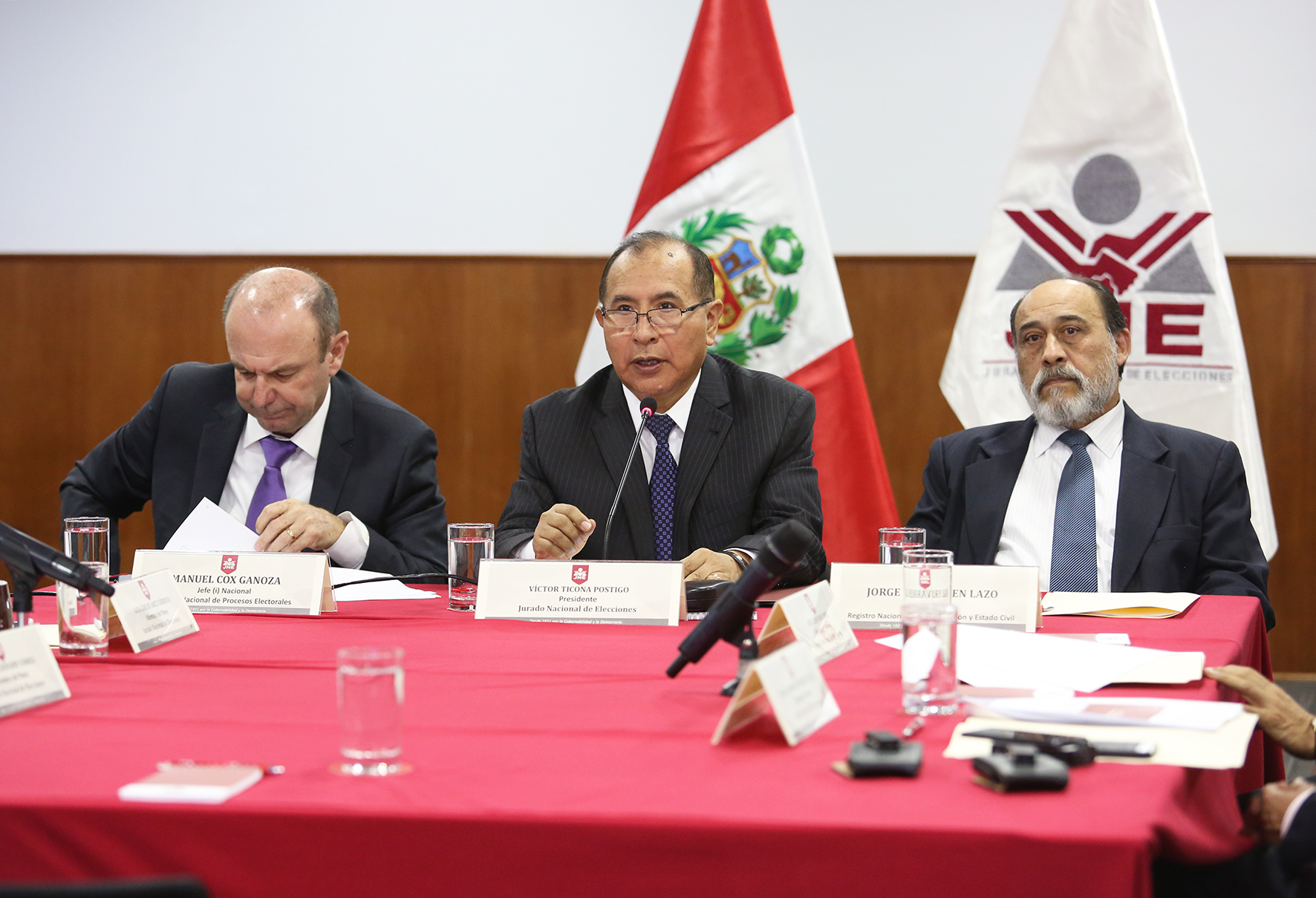 En la sesión, presidida por el titular del Jurado Nacional de Elecciones (JNE), Víctor Ticona, participaron los jefes de la Oficina Nacional de Procesos Electorales, Manuel Cox, y del Registro Nacional de Identificación y Estado Civil (Reniec), Jorge Yrivarren, así como miembros del Pleno y funcionarios de los tres organismos electorales.