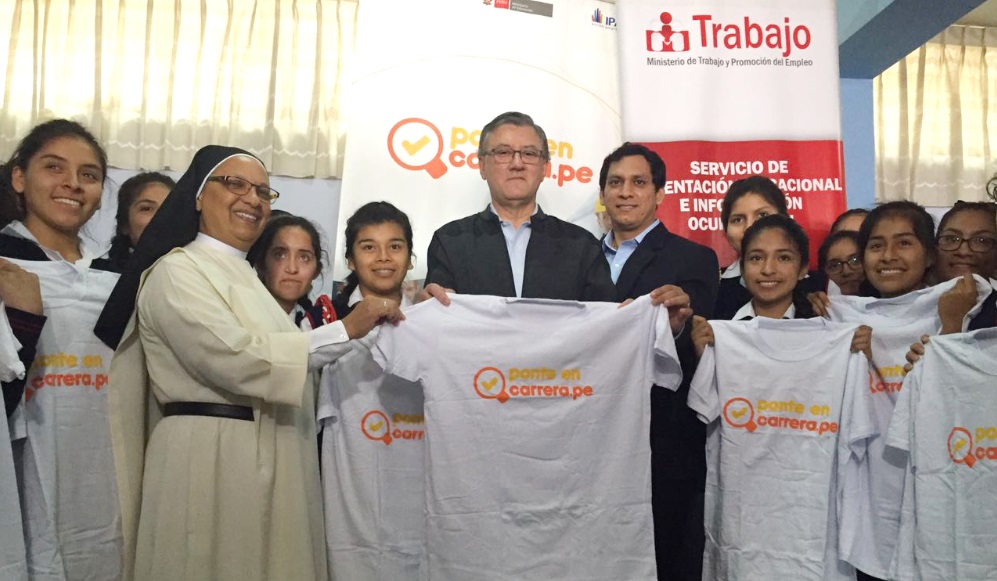 El ministro de Trabajo y Promoción del Empleo, Alfonso Grados Carraro, destacó las ventajas del portal web “Ponte en Carrera” a alumnas de los últimos años de secundaria de la institución educativa Santa Rosa de la ciudad de Trujillo.
