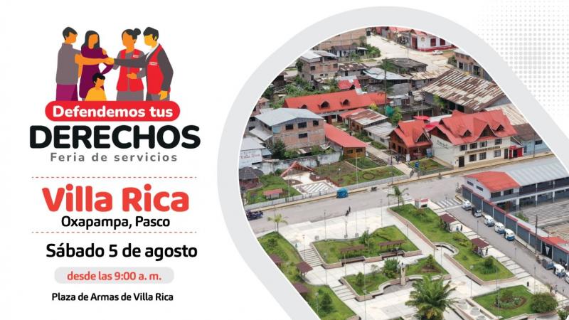Este sábado 05 de agosto, el Ministerio de Justicia y Derechos Humanos (MINJUSDH) llevará a cabo la tercera feria descentralizada “Defendemos tus derechos” en la Plaza de Armas de Villa Rica, en la provincia de Oxapampa, con la finalidad de acercar los servicios del sector a la población de esa zona del país.