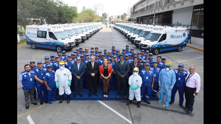 La presidenta ejecutiva de EsSalud, Fiorella Molinelli, presentó esta mañana un lote de 30 modernas ambulancias, totalmente equipadas con tecnología de punta, que serán utilizadas para el traslado oportuno de los pacientes críticos hacia los hospitales de Lima Metropolitana a fin de que reciban pronta atención médica.