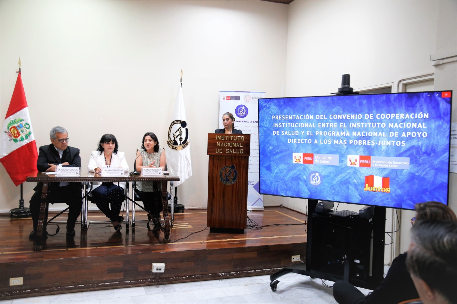 La firma del acuerdo estuvo presidida por la viceministra de Salud Pública, María Elena Aguilar, el jefe del INS, Víctor Suárez, y la directora General del Programa Juntos, Jessica Niño de Guzmán.
