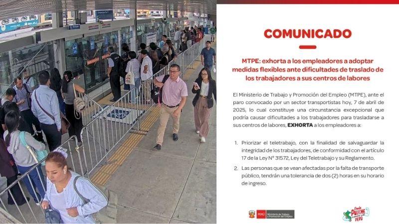 Mediante un comunicado, el MTPE  exhortó a los empleadores a adoptar medidas flexibles que permitan compensar las demoras derivadas por los contratiempos en el traslado de los trabajadores que acuden a sus centros laborales y pidió priorizar el teletrabajo, con la finalidad de salvaguardar la integridad de las personas.