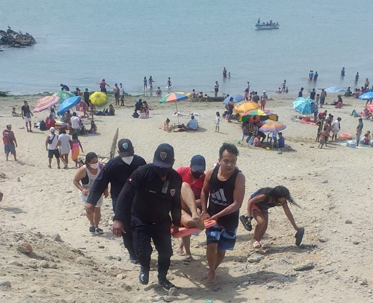Efectivos de la Policía Nacional del Perú, con apoyo del personal municipal, hacen el resguardo respectivo con el propósito de evitar que algunas personas irresponsables se aventuren a hacer uso de la playa, corriendo el riesgo de ser picados por las rayas.