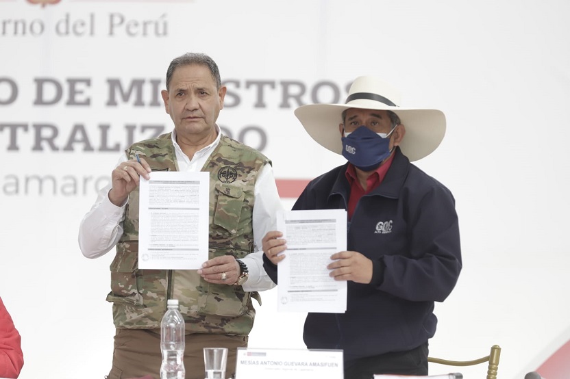 Dicho convenio fue rubricado por el ministro de Defensa, José Luis Gavidia Arrascue, y el gobernador regional de Cajamarca, Mesías Guevara Amasifuen, en presencia del presidente de la República, Pedro Castillo Terrones, y del presidente del Consejo de Ministros, Aníbal Torres Vásquez, entre otros ministros de Estado.