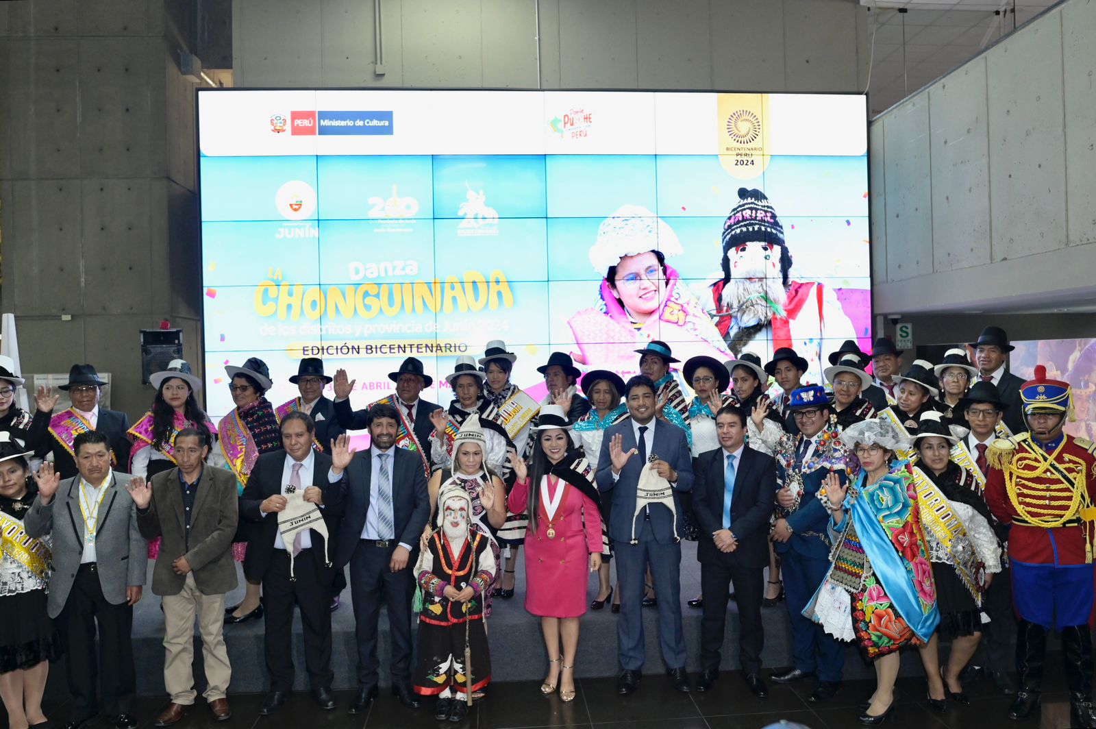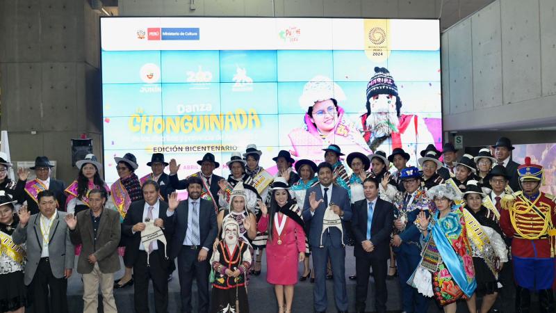 Un elenco conformado por más de un centenar de danzantes y mayordomos juninenses deslumbraron esta mañana con una presentación de esta histórica danza en la explanada del Ministerio de Cultura. La elegancia de los chonguinos y la energía de los chutos transportaron a los espectadores a Junín, donde la danza de la chonguinada –declarada Patrimonio Cultura de la Nación el 7 de abril de 2022– es pilar de la identidad cultural.