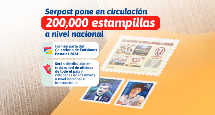 Serpost, entidad adscrita al Ministerio de Transportes y Comunicaciones (MTC), ha iniciado la circulación de 200 000 nuevas estampillas que conforman el Calendario de Emisiones Postales 2024, las cuales serán distribuidas en toda su red de oficinas del país y podrán ser colocadas en los envíos a nivel nacional e internacional o ser adquiridas por los filatelistas para colección.