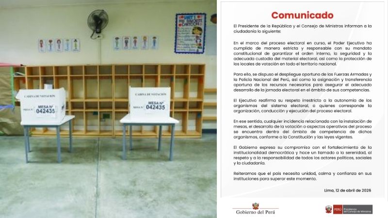 El Poder Ejecutivo emitió un comunicado oficial en el que informa sobre las acciones adoptadas en el marco del proceso electoral. El pronunciamiento fue suscrito por el Presidente de la República y el Consejo de Ministros, quienes señalaron que se ha cumplido con el mandato constitucional vinculado a la seguridad y al orden interno en todo el territorio nacional.