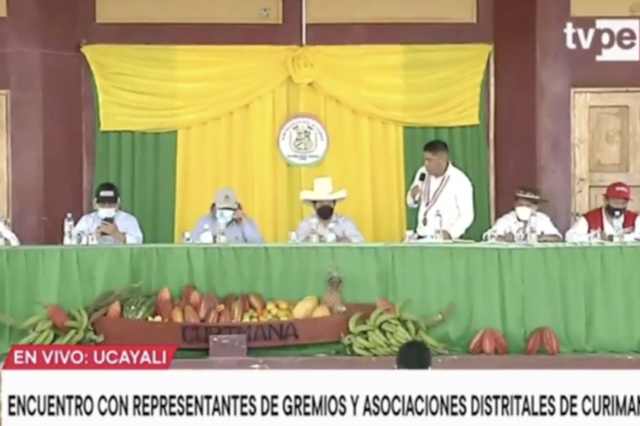 Un encuentro con el alcalde del distrito de Curimaná, y representantes de gremios y asociaciones, en la región Ucayali sostiene el presidente de la República, Pedro Castillo.