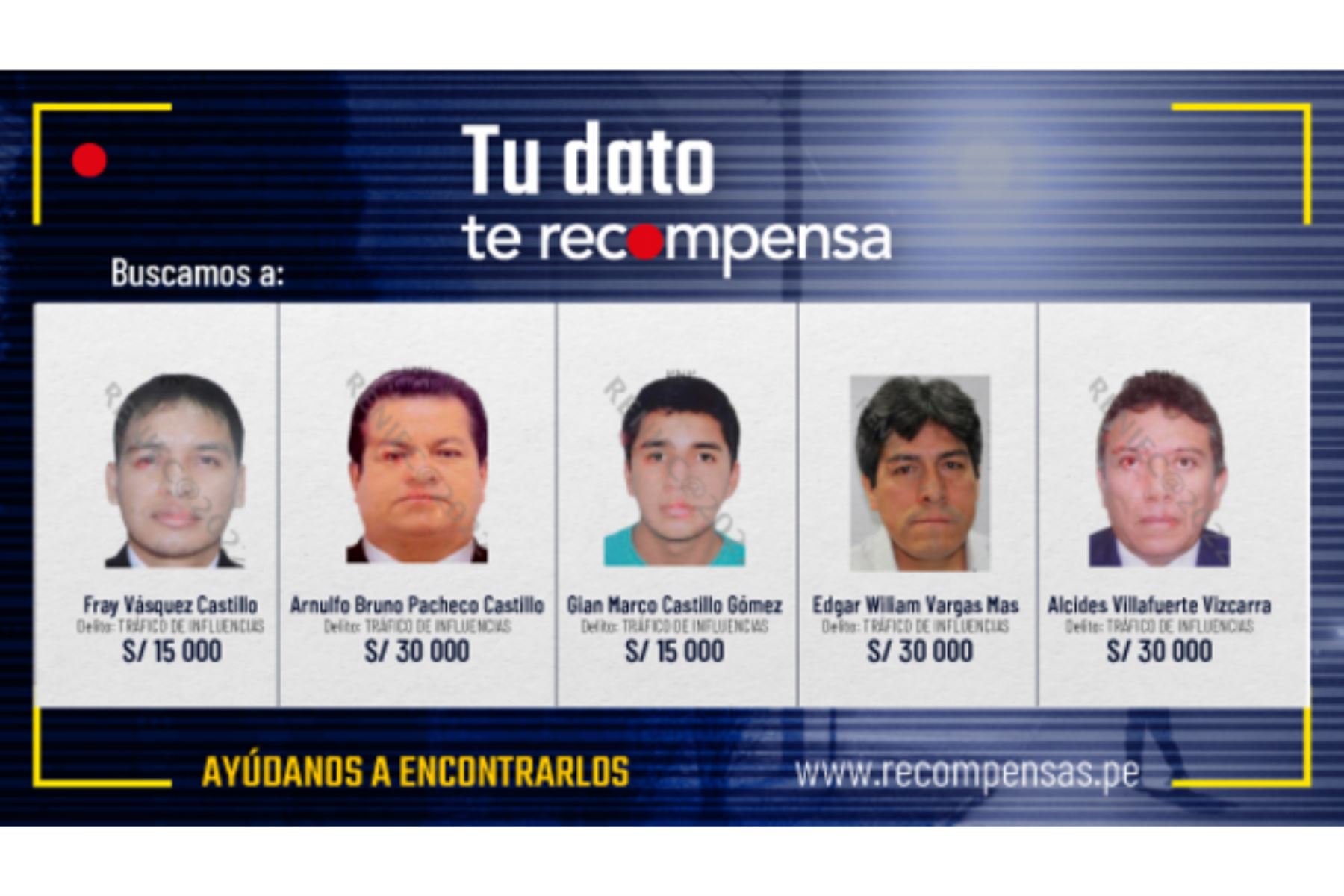 Para Pacheco Castillo, Vargas Mas y Villafuerte Vizcarra se estableció en S/ 30 000 el monto de la respectiva recompensa; mientras que para Vásquez Castillo y Castillo Gómez, el beneficio económico se fijó en S/ 15 000.