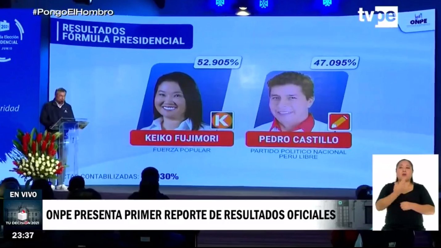 Al 73.702 % de actas procesadas por la Oficina Nacional de Procesos Electorales (ONPE), la candidata presidencial por Fuerza Popular, Keiko Fujimori Higuchi, obtiene el 52.319 % de los votos válidos; seguido del postulante por Perú Libre, Pedro Castillo Terrones, con 47.681 %.