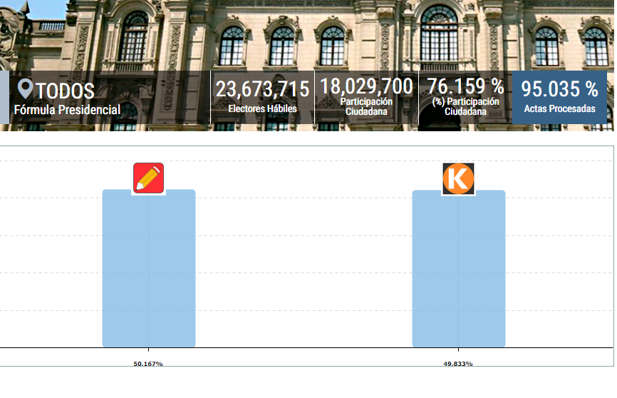 La Oficina Nacional de Procesos Electorales (ONPE) informó que el candidato de Perú Libre, Pedro Castillo, obtiene el 50.167% de la votación nacional, seguido por Keiko Fujimori de Fuerza Popular, con 49.833%, al 95.035% de las actas procesadas.
