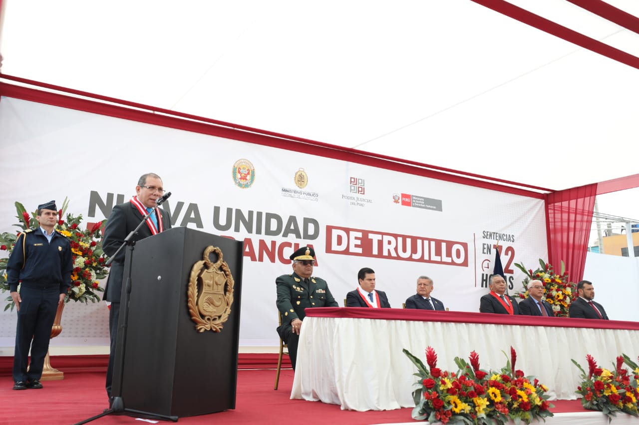 El presidente del Poder Judicial, Javier Arévalo, inauguró hoy en Trujillo, ciudad que presenta altos índices de criminalidad, la decimosegunda unidad de flagrancia de La Libertad, que es la más grande, la más moderna y mejor equipada del país, con la finalidad de combatir con rapidez, eficacia y de manera ejemplar a referido flagelo.
