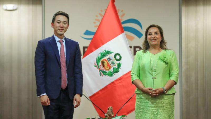 La presidenta de la república, Dina Boluarte Zegarra junto a la ministra de la Mujer y Poblaciones Vulnerables, Teresa Hernández Cajo, se reunieron este viernes con Shou Zi Chew, CEO de la red social TikTok, para impulsar el desarrollo digital y económico inclusivo en el país.