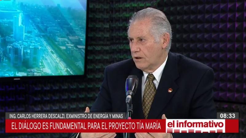 El ex ministro de Energía y Minas, Ing. Carlos Herrera Descalzi, se pronunció en relación al otorgamiento de la licencia para la construcción del yacimiento minero de Tía María y comentó que ello no implica una explotación inmediata, sino el inicio de conversaciones que van a incluir a la empresa, el Estado y la población.