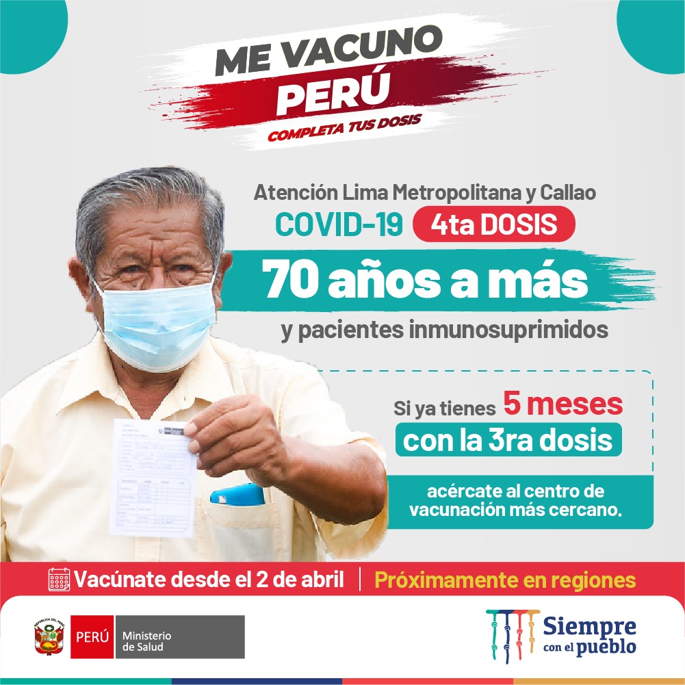 Alexis Holguín, director general de Intervenciones Estratégicas de Salud Pública del Minsa, indicó que en los próximos días se continuará con la aplicación de la cuarta dosis a este grupo etario en las regiones del país, mientras que el personal de salud recibirá esta dosis a partir del lunes 4 o martes 5 de abril.