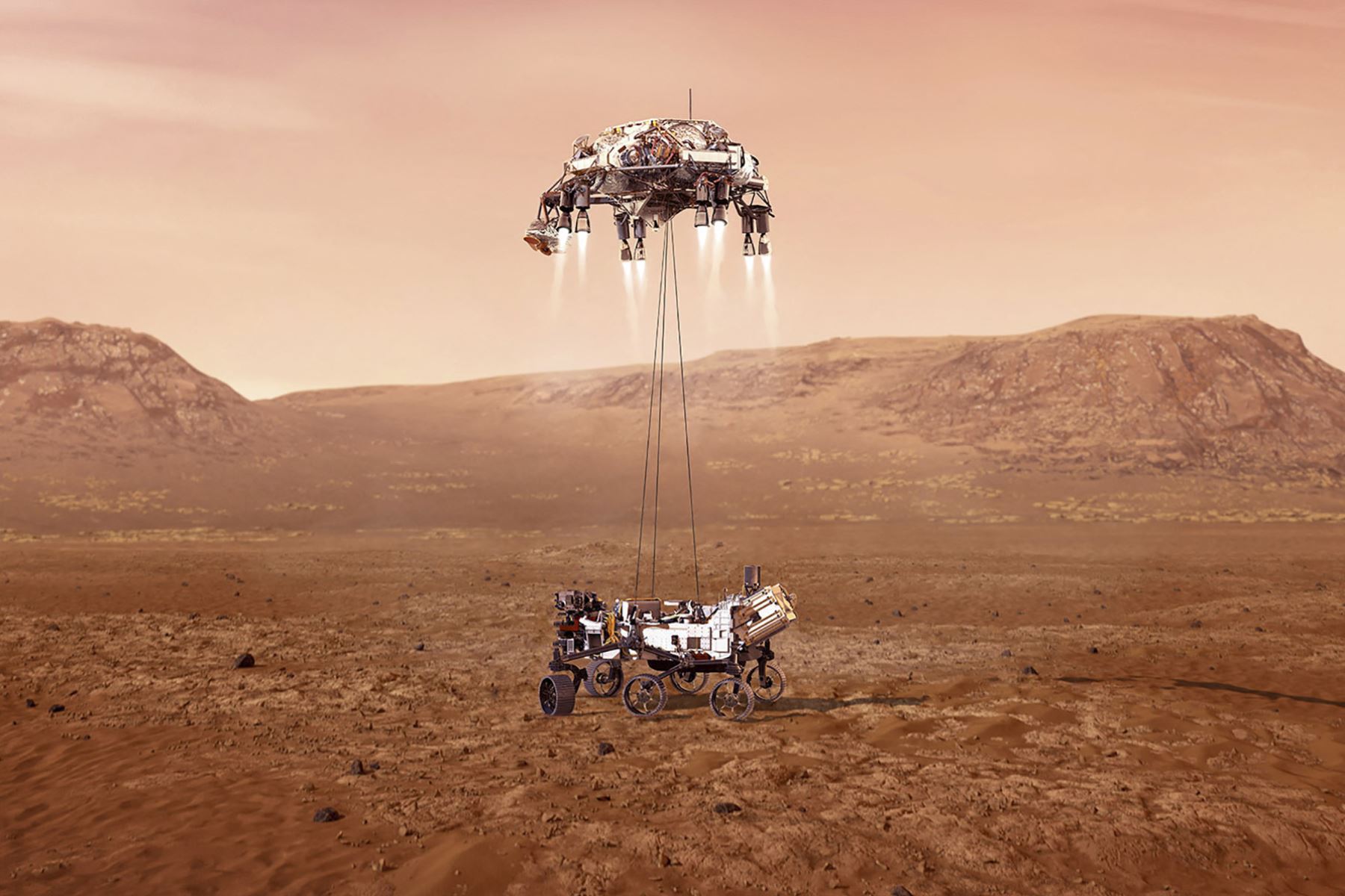 Perseverance, de 6 ruedas, cerca 3 metros de largo y de 1.025 kilogramos, buscará en Marte señales de vida microbiana pasada y recolectará muestras selectas de rocas y sedimentos para su envío futuro a la Tierra.