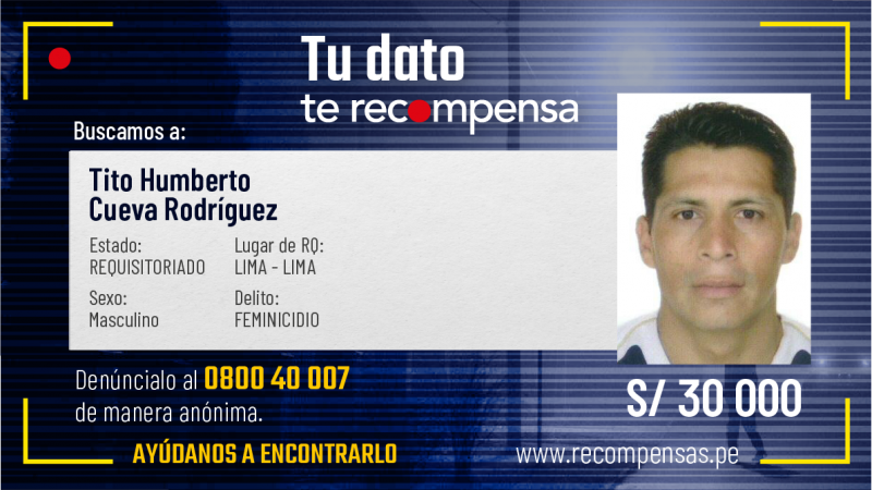 El Programa de Recompensas del Ministerio del Interior incluyó a Tito Humberto Cueva Rodríguez condenado a 22 años de cárcel por el delito contra la vida, la salud y el cuerpo, bajo la modalidad de feminicidio.